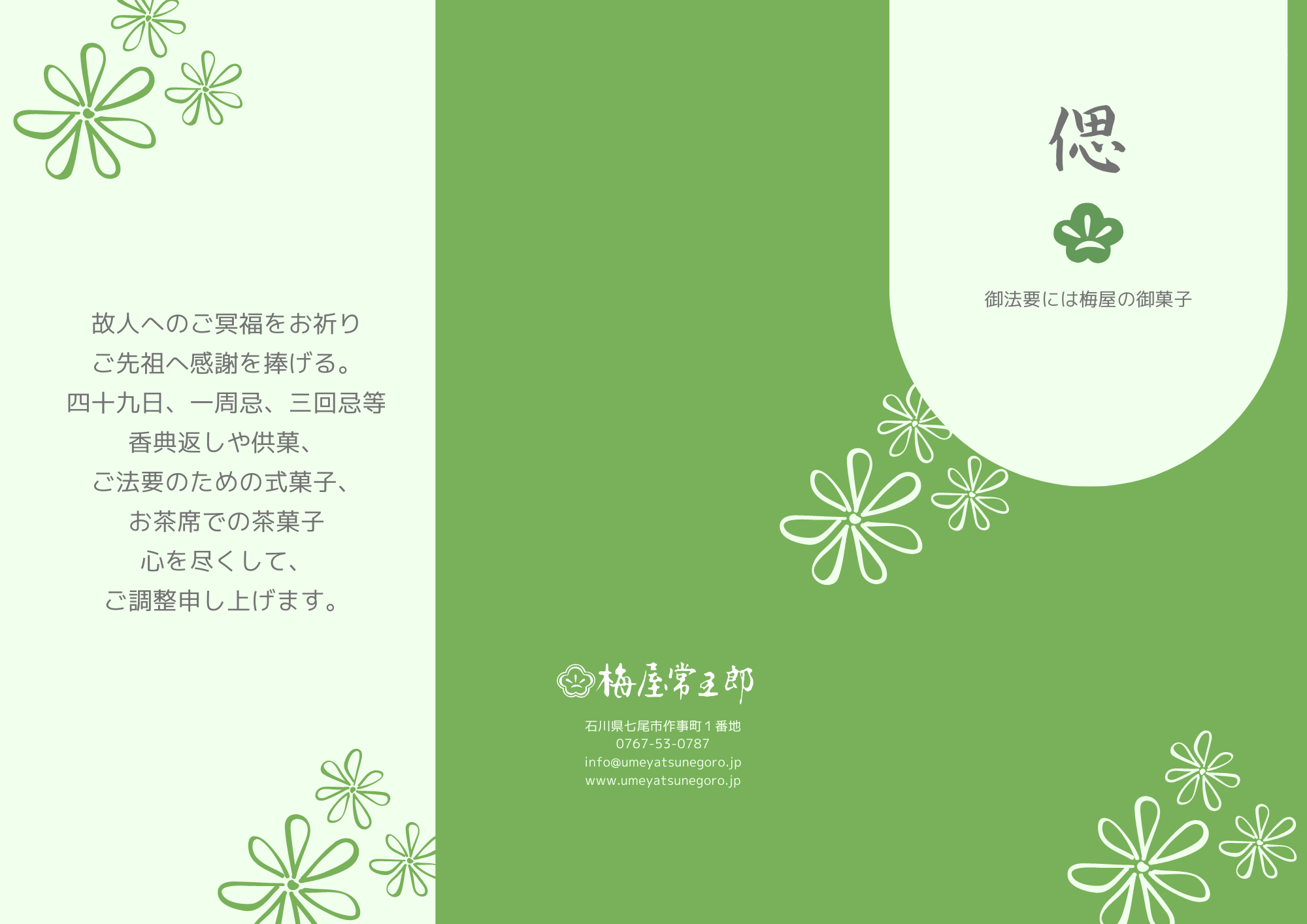 当店では、四十九日・一周忌・三回忌・七回忌など、また、ご香典返しや供養などご法要のためのお式菓子、お茶席でのお菓子など、心を尽くしてご調整いたします。